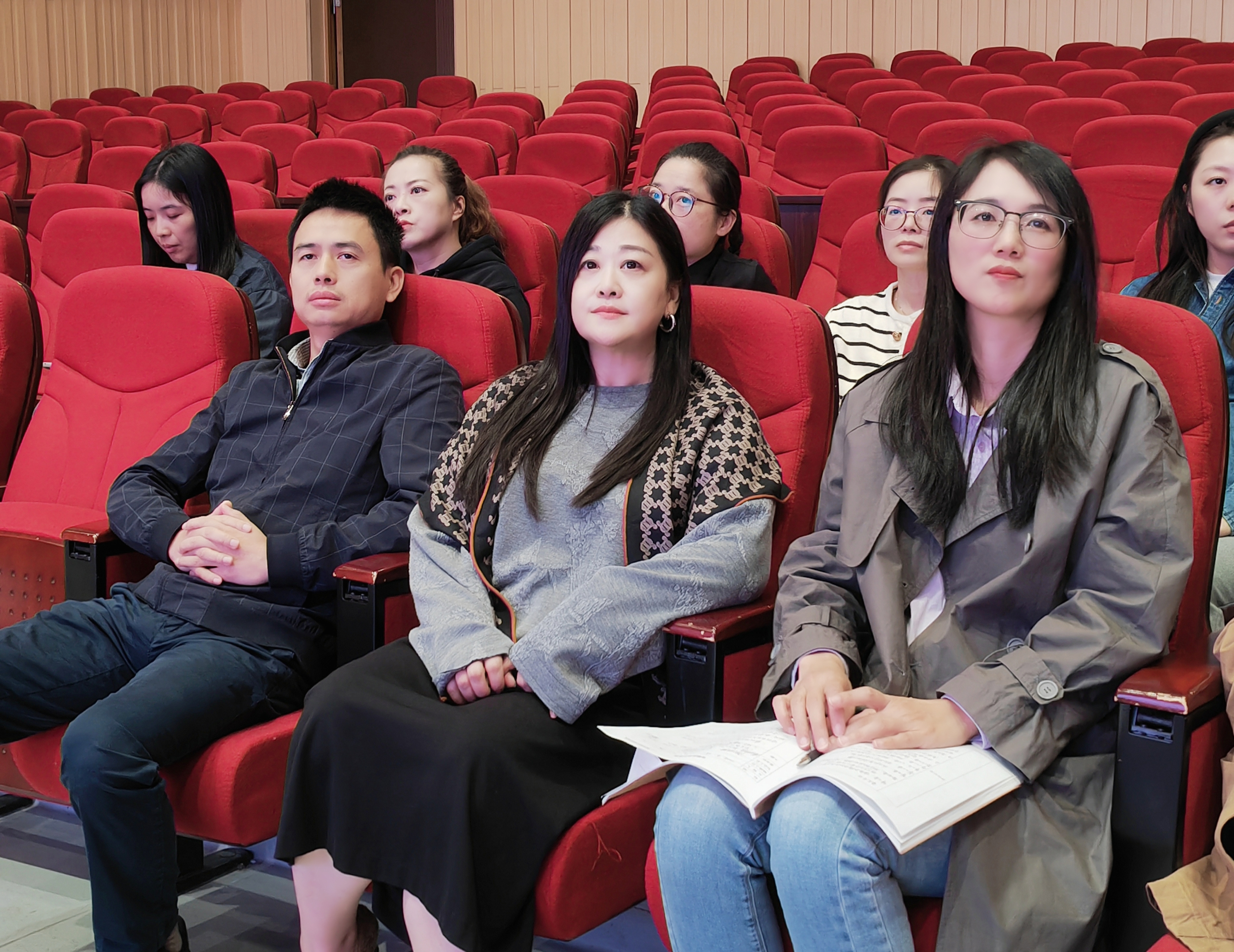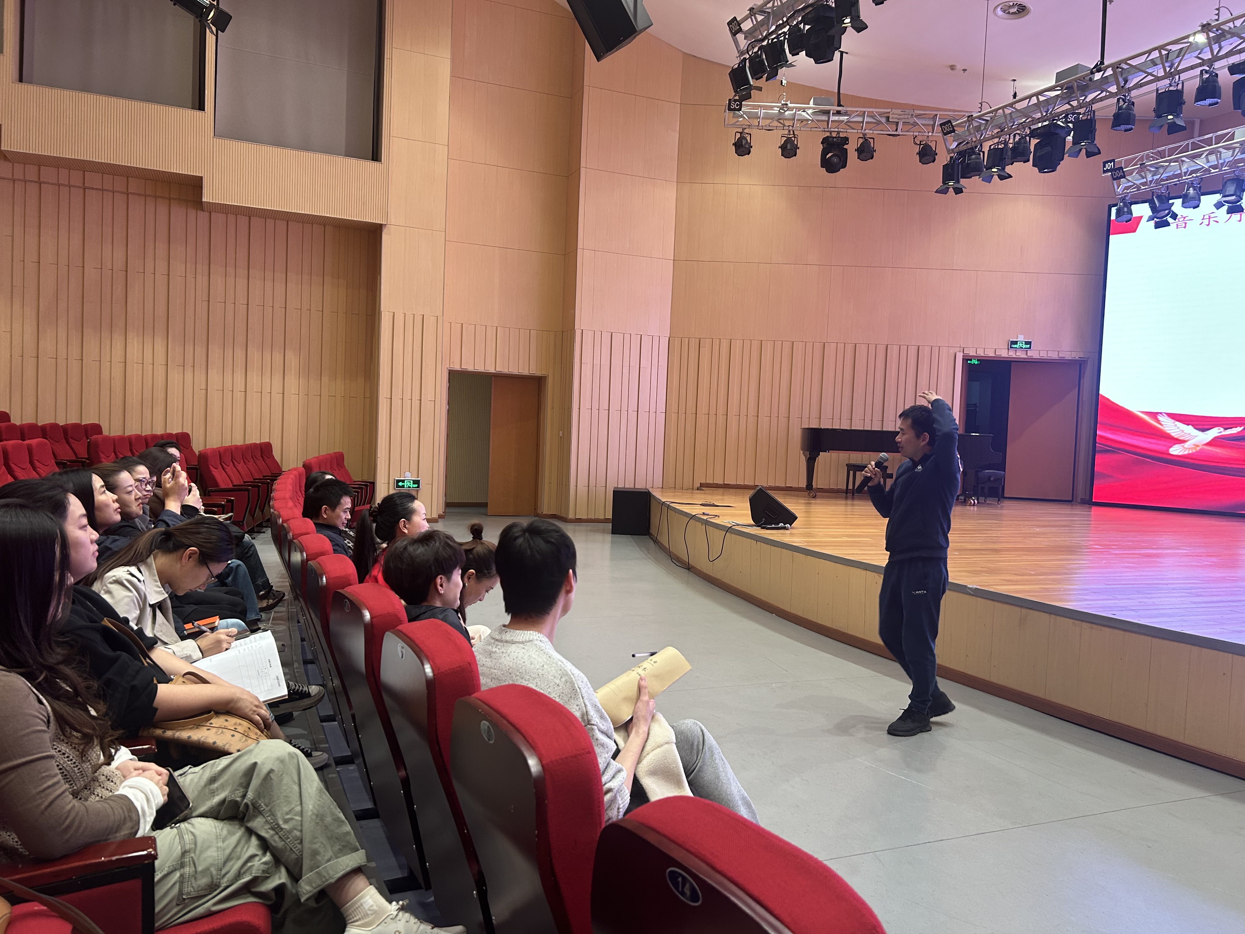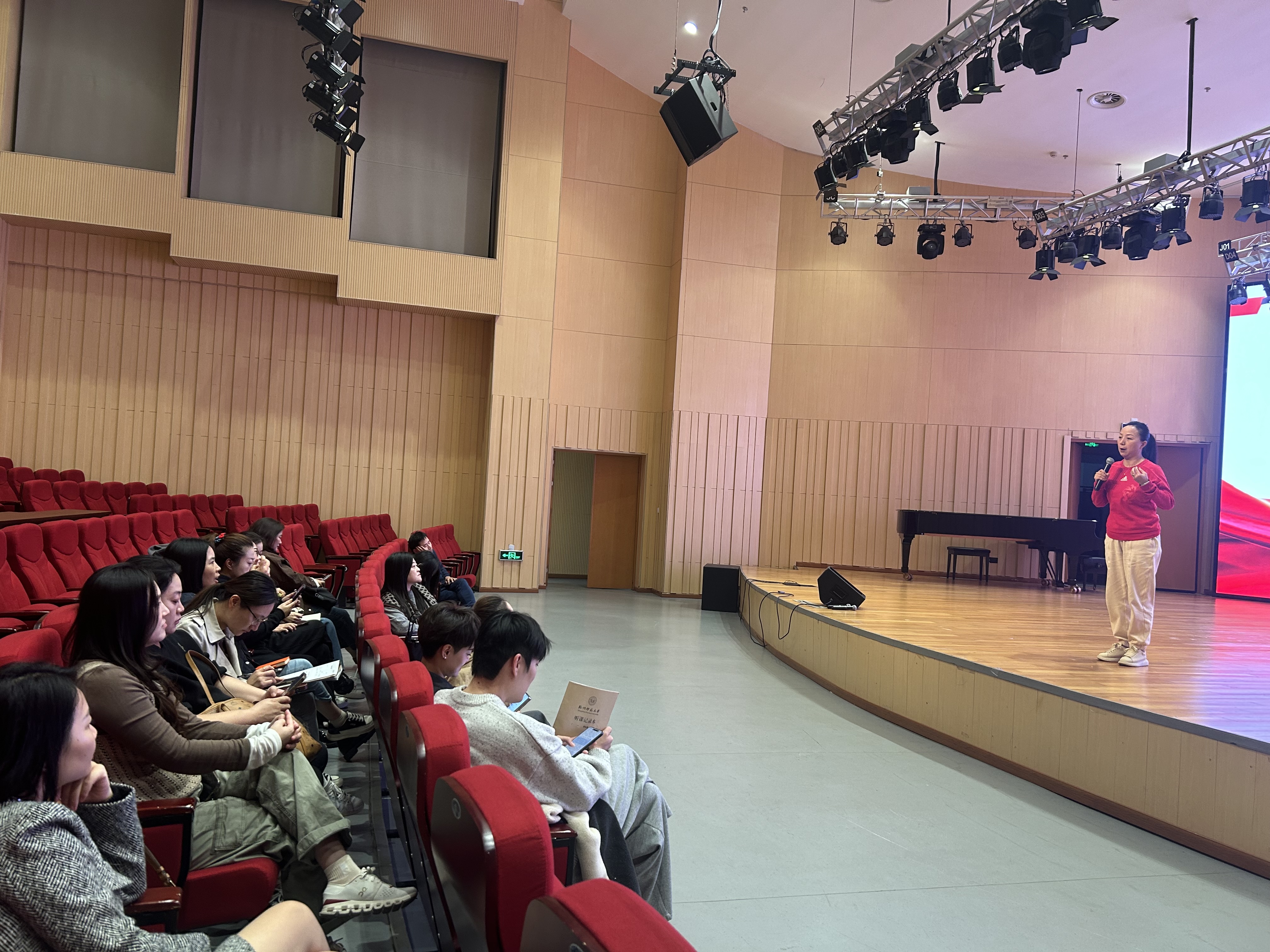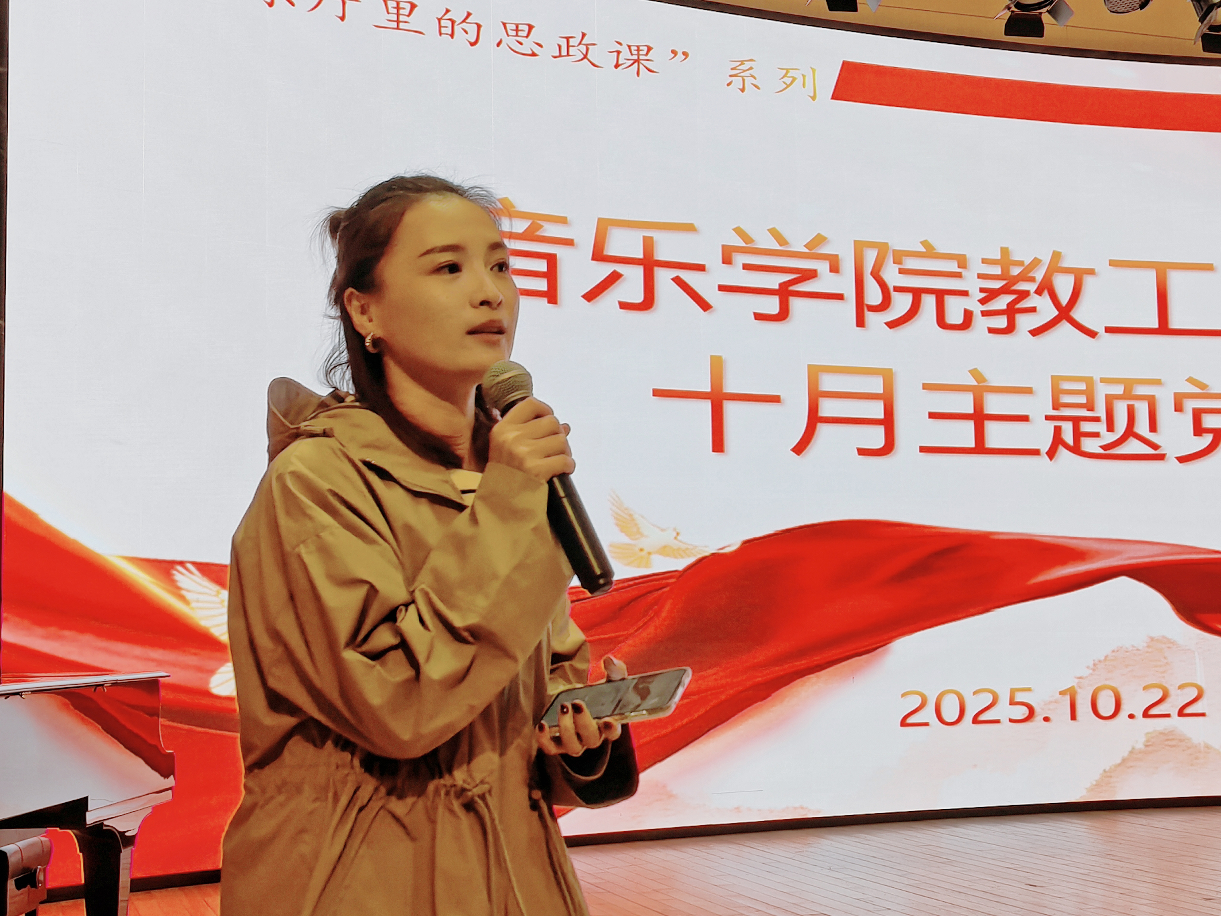 10月22日下午,52av 西林音乐厅内乐音袦绕、舞影翩跹,一场别开生面的党日活动在此精彩上演。此次活动由学院学术副院长、教工支部副书记杨欣欣老师主持,打破传统会议室学习的常规模式,创新性地走进音乐厅,以欣赏红色题材舞剧《秀水泱泱》为载体,将音乐舞蹈艺术与思政教育深度融合,精心打造“音乐厅里的思政课”这一特色党建品牌,让思政学习在艺术氛围中焕发出全新的活力。