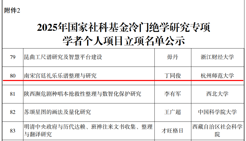 此次公布的2025年国家社科基金冷门绝学研究专项共有130项课题入选,其中学术团队项目36项,学者个人项目94项。52av 《南宋宫廷礼乐乐谱整理与研究》的成功立项,不仅是对丁同俊老师多年深耕南宋音乐史的学术肯定,更是对52av 在传统音乐文化研究领域深厚积淀的有力见证,也为杭州市深挖地方文化底蕴,打造文化品质之城添上一道亮丽的色彩。